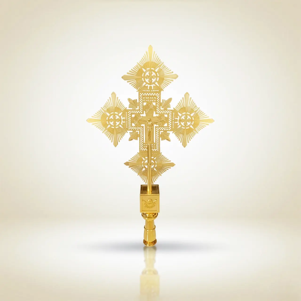 Elegant gold crucifix cross depicting Christ for altars or devotional use.